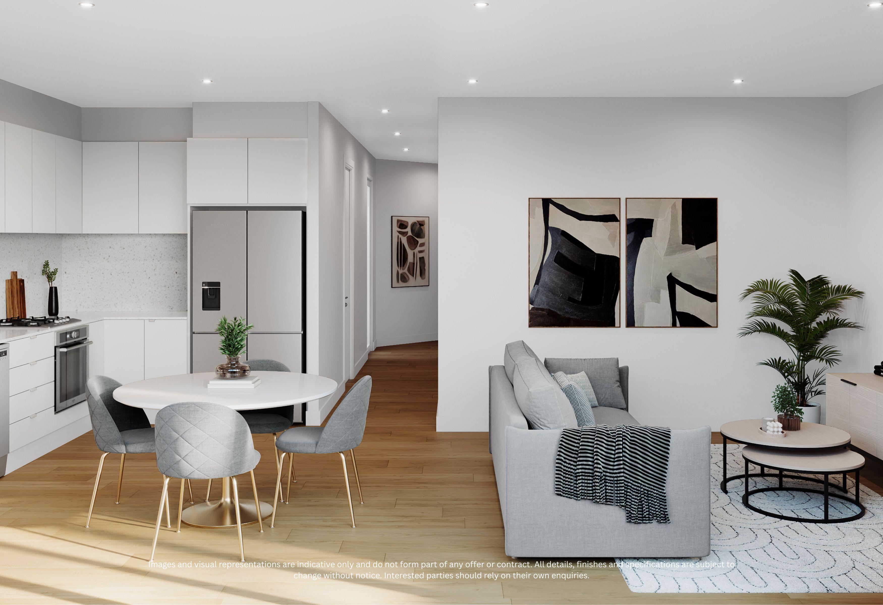 The light-filled open-plan living and dining area flows seamlessly to the kitchen, creating a welcoming space for both relaxing and entertaining. The contemporary kitchen is finished with quality appliances, ample storage, and sleek benchtops, making it the perfect hub of the home.